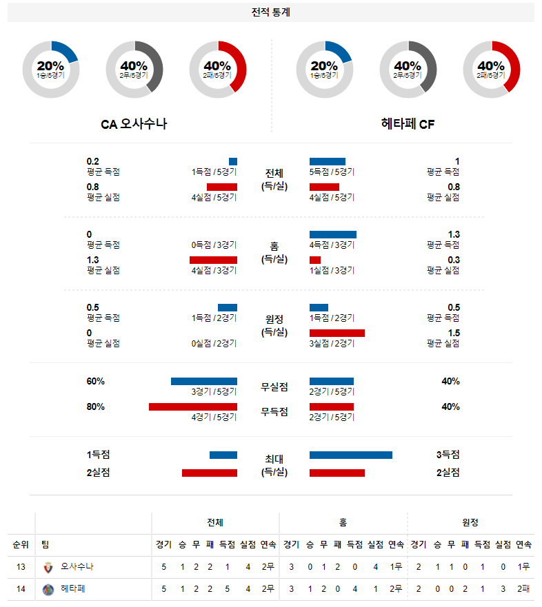 2. 오사수나 이번 시즌 홈 성적 : 14전 4승 4무 6패 (무실점 비율 : 28%, 무득점 비율 : 36%)