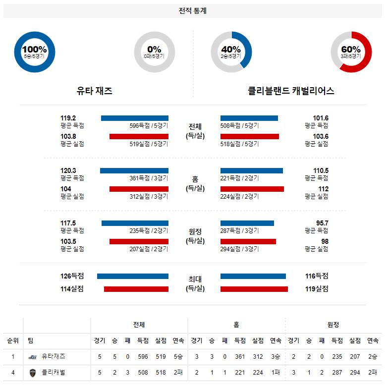 유타는 여전히 완벽한 공수 밸런스를 선보이고 있다. 미첼의 득점력, 고베어의 공중볼 장악 능력까지 빈틈이 없다. 반면 클리블랜드는 섹스턴이 돌아왔지만 섹스턴을 보좌해줄 수 있는 선수가 전무하다. 유타가 승리할 전망이다.