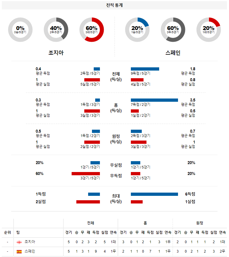 3. 스페인 최근 원정 성적 : 5전 4무 1패 (무실점 비율 : 20%, 무득점 비율 : 40%)