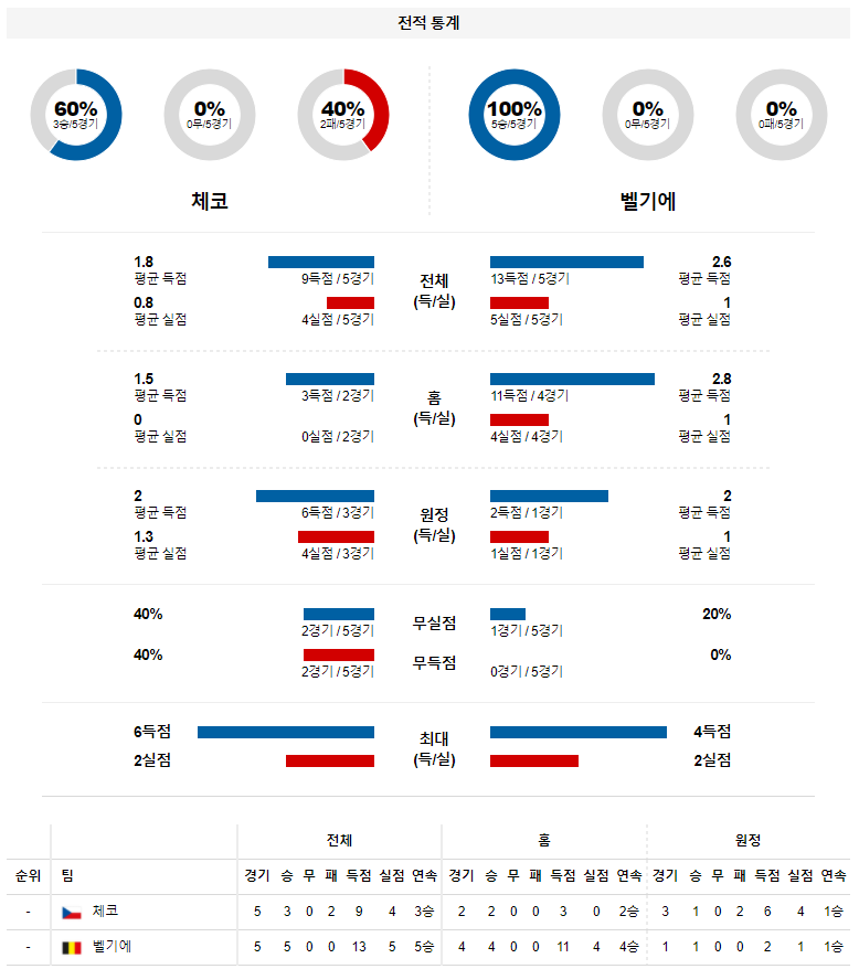 지난 웨일스 전에서 3-1 승리를 거두며 최근 A매치 5연승을 달리고 있다. E.아자르(LWF)가 부상을 당했지만 T.아자르(LWF)가 빈자리를 완벽하게 메워줬고, 데 브라위너(CAM)가 수비형 미드필더가 아닌 드디어 공격형 미드필더로 배치되며 제자리를 찾자 이전보다 공격 작업이 훨씬 수월해진 모습이다. 데 브라위너와 루카쿠(ST) 모두 골을 터트리며 수준급의 득점력을 이어갔다. 이번 경기에서도 대량 득점 가능성이 충분하다.