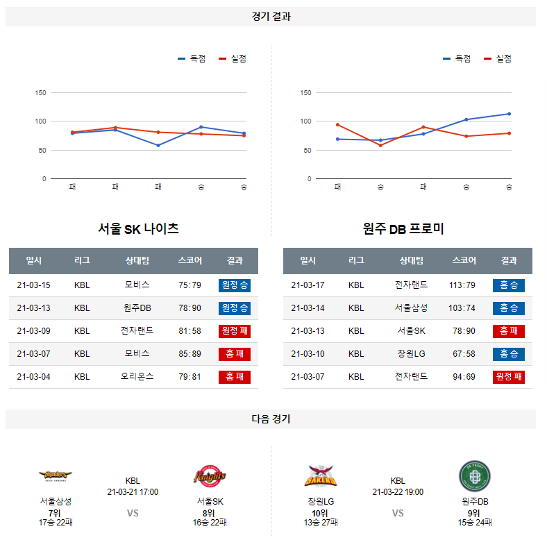 서울SK는 직전경기(3/15) 원정에서 울산모비스 상대로 79-75 승리를 기록했으며 이전경기(3/13) 원정에서 원주DB 상대로 90-78 승리를 기록했다. 2연승 흐름 속에 시즌 19승27패 성적. 울산모비스 상대로는 닉 미네라스(4득점)가 부진한 모습을 보이면서 불안한 출발을 보였지만 2쿼터(24-17)에 승기를 잡는 과정에서 최성원(10득점, 7어시스트)가 게임 체인저가 되었고 5명의 선수가 두 자리수 득점을 기록하는 고른 활약이 나온 경기. 안영준(13득점)과 김선형(14득점, 5어시스트)이 팀 스피드를 끌어 올렸고 세트 오펜스에서는 자밀 워니(16득점, 9어시스트)를 활용한 투맨 게임으로 상대 수비를 흔들었던 상황. 또한, 더블-더블을 기록한 최부경(13득점 10리바운드)의 역할 분담도 좋았으며 승리에 대한 열정을 불태우며 몸을 던지는 허슬 플레이도 나왔던 승리의 내용.