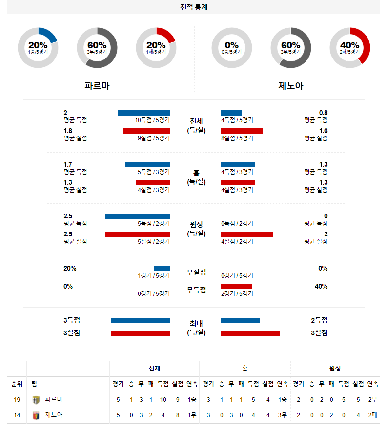 1. 최근 5경기 맞대결 : 5전 5승 15득점 4실점 (파르마 우세)