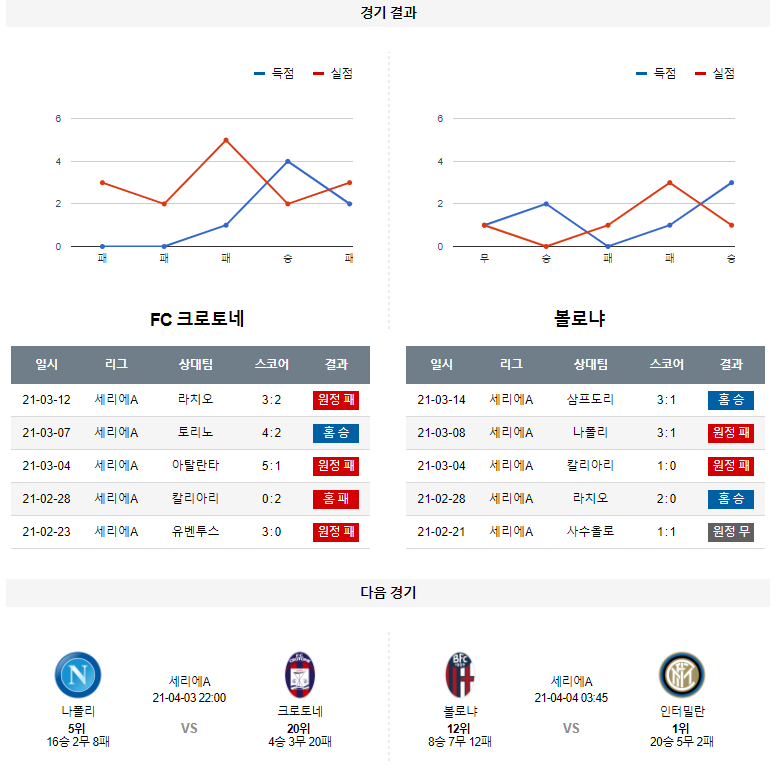 1. 최근 6경기 맞대결 : 6전 4승 2패 8득점 4실점 (볼로냐 우세)