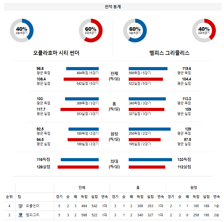 반면, 오클라호마는 백투백 원정 이였고 샤이 길저스-알렉산더(22득점, 6어시스트, 3리바운드)가 부상에서 돌아오는 호재가 있었고 6명의 선수가 두 자리수 득점을 기록하는 가운데 19개 3점슛을 성공시켰지만 턴오버(18개)가 많았고 제공권 싸움에서 밀렸던 경기. 주전 빅맨 알 호포드의 결장으로 골밑 싸움에서 밀렸으며 팽팽했던 경기 흐름이 4쿼터(36-28)에 넘어가는 과정에서 샤이 길저스-알렉산더가 에이스 맞대결에서 트리플 더블을 기록한 자 모란트에게 판정패를 당했던 패배의 내용.
