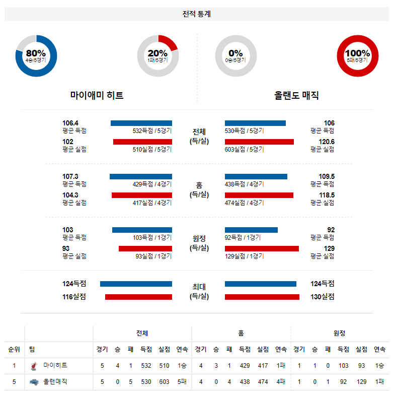 마이애미는 직전경기(3/5) 원정에서 뉴올리언즈 상대로 103-93 승리를 기록했으며 이전경기(3/3) 홈에서 애틀란타 상대로 80-94 패배를 기록했다. 애틀란타와 리턴매치에서 6연승이 중단 되는 패배가 나왔지만 연패를 막고 승리를 추가했으며 시즌 18승18패 성적. 뉴올리언즈 상대로는 이전 경기 결장했던 지미 버틀러(29득점 9어시스트)가 부상에서 돌아와 에이스의 위엄을 선보였고 승부처에 강력한 수비력이 돋보인 경기. 뱀 아데바요의 결장으로 리바운드 싸움에서 마이너스 마진을 기록했지만 슛거리가 긴 켈리 올리닉(18득점, 7어시스트, 10리바운드)을 활용한 스몰 라인업으로 1쿼터(31-15)에 런을 만들어 냈던 것이 많은 도움이 되었던 상황. 또한, 부상 복귀후 컨디션을 끌어올리고 있는 고란 드라기치(13득점)의 모습도 확인할수 있었으며 안드레 아궈달라(10득점)가 세컨 유닛 싸움에서 판정승을 이끌어 냈던 승리의 내용.