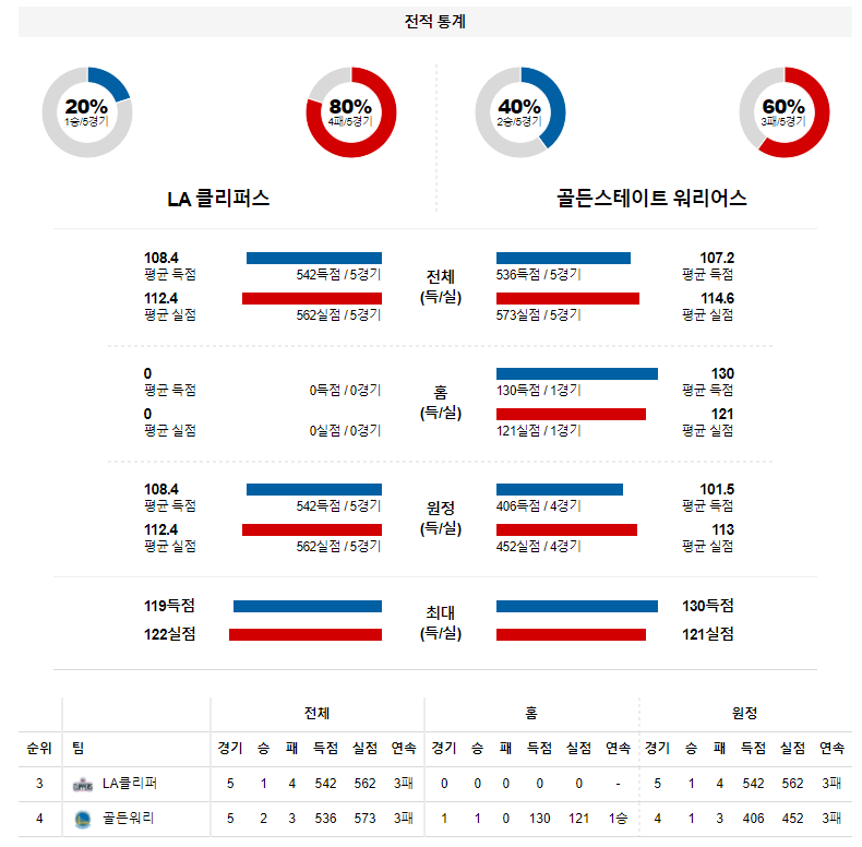 반면, LA클리퍼스는 후반전(40-64) 수비가 무너졌고 상대에게 20개 3점슛을 48.8의 높은 적중률 속에 허락한 경기. 폴 조지(25득점)와 카와이 레너드(24득점)가 분전했지만 18개 턴오버를 쏟아냈고 벤치 득점에서 밀렸던 상황. 또한, 커리에게 협력 수비를 들어갔을때 커리에게서 나온 한번의 패스에 오픈 찬스를 허용했고 빅맨 싸움에서도 밀렸던 패배의 내용.
