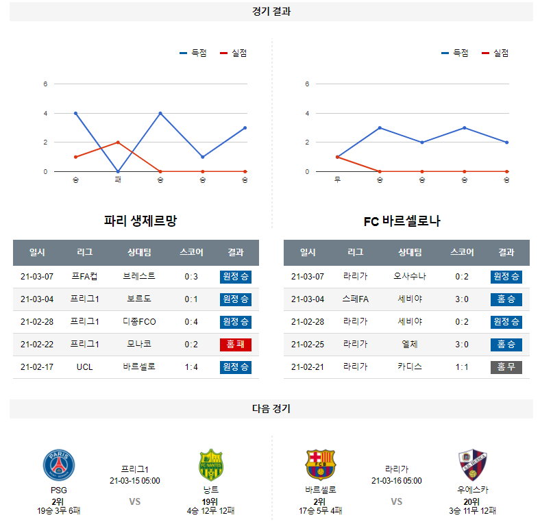 1. 최근 6경기 맞대결 : 6전 4승 2패 15득점 11실점 (바르셀로나 우세)
