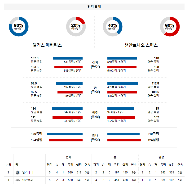 댈러스는 다음날 오클라호마 백투백 원정을 위해서 힘을 분산해야 한다. 5점차 이내 승부 가능성을 배제할수 없다.