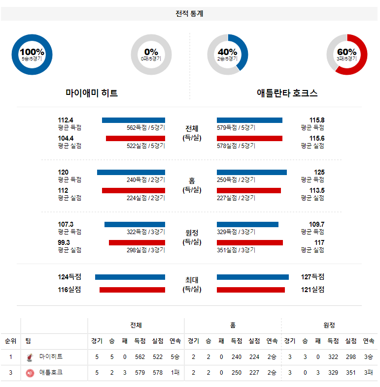 애틀란타는 7경기째 연승도 연패도 없는 승패의 반복 패턴을 보이고 있고 경기력의 기복 현상이 매우 심한 모습 이다. 또한, 마이애미는 아직 부상자들이 많은 전력 이다.