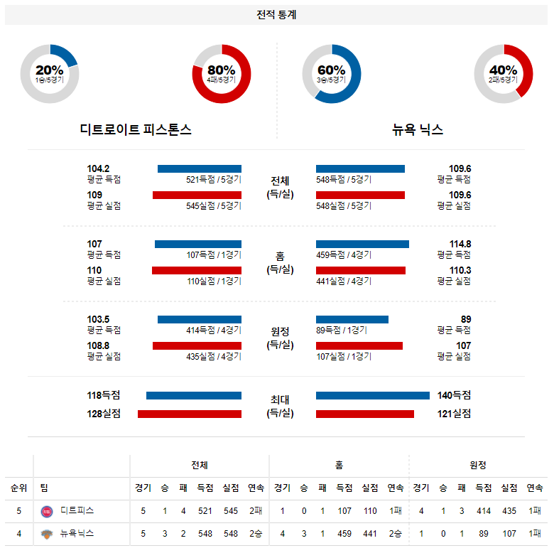 동부컨퍼런스 최하위를 기록중인 디트로이트 이지만 원정(3승15패)과 달리 홈(6승9패)에서는 강팀들을 상대로도 선전하는 모습을 보여주고 있다. 또한, 이동 없이 휴식후 연속 되는 홈경기 일정에서 백투백 원정에 있는 뉴욕을 만나는 효과도 기대가 되는 타이밍. 디트로이트 승리 가능성을 추천 한다.
