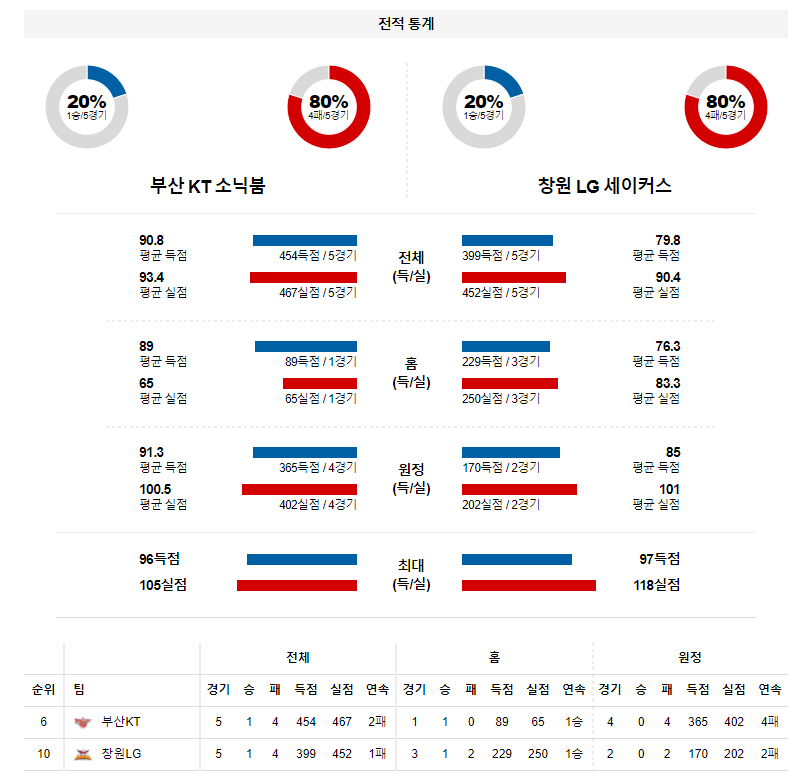 3라운드 맞대결 에서는 부산KT가 원정에서 98-88 승리를 기록했다. 양홍석(25득점, 13리바운드)이 상승세 리듬을 이어갔고 김영환(25득점)의 시즌 하이 득점이 터졌던 경기. 허훈(14득점, 8어시스트, 6리바운드)이 포인트가드 싸움에서 우위를 점령했으며 브랜든 브라운(23득점)의 꾸준함도 나타난 상황. 반면, 창원LG는 3쿼터 종료시점 까지는 4점차 리드(71-67)를 잡고 있었지만 4쿼터(17-31) 외곽 수비가 무너지면서 역전패를 당한 경기.