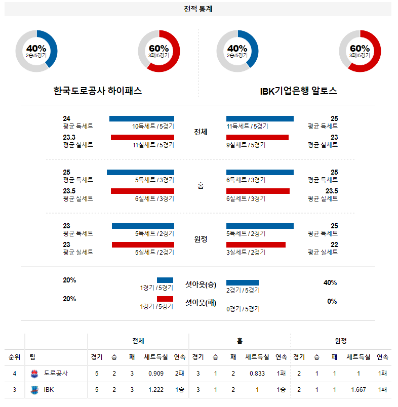 베테랑 선수가 많은 도로공사에게 충분했던 재충전의 시간이 보약이 되어줄 것이며 승점 2점 차이로 3위 IBK기업은행을 추격하고 있는 상황이기에 '봄 배구' 진출을 위한 동기부여에 따른 높은 집중력도 보장이 되는 타이밍 이다. 또한, 전체 리시브 효율성 최하위를 기록중인 IBK기업은행(30.00%)의 문제점이 리시브 효율성 1위 도로공사(41.17%)와 경기에서는 더욱 표시가 날것이다. 한국도로공사 승리 가능성을 추천 한다.