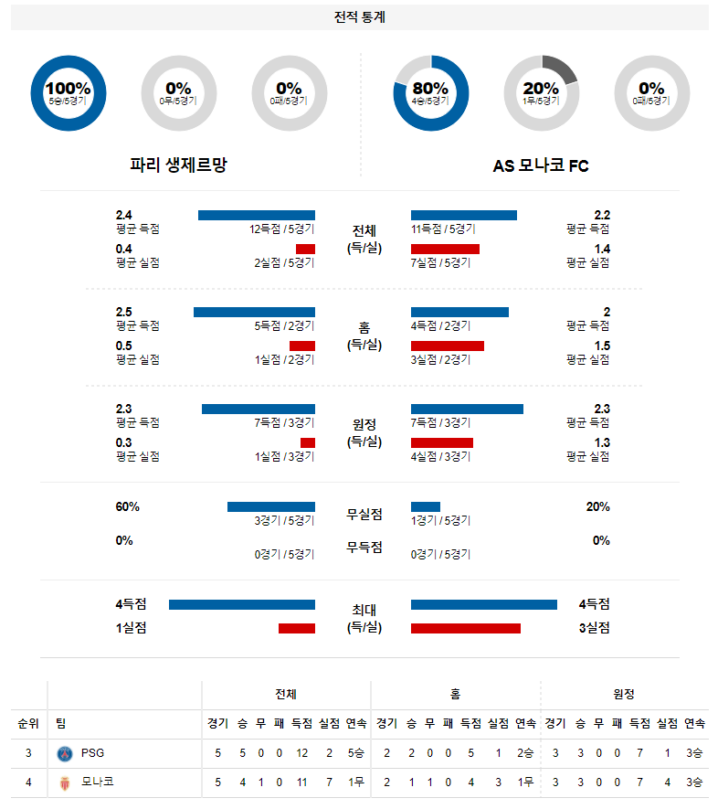 3. 모나코 올 시즌 원정 성적 : 12전 7승 5패 (무실점 비율 : 17%, 무득점 비율 : 8%)