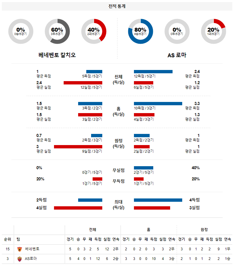 1. 최근 4경기 맞대결 : 4전 3승 1패 15득점 6실점 (로마 우세)