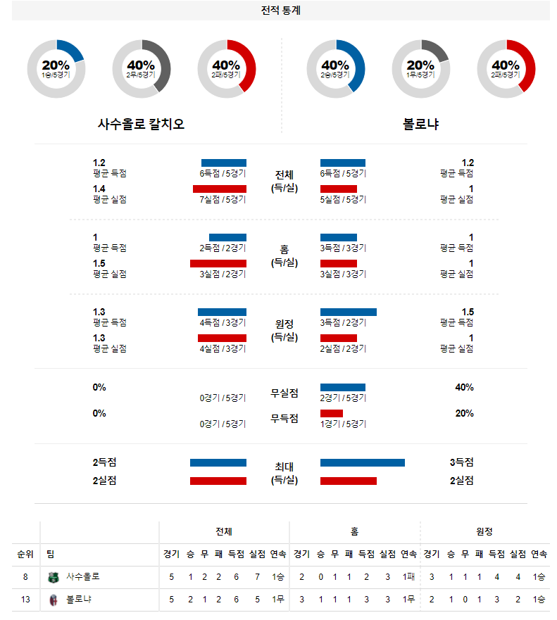 2. 사수올로 이번 시즌 홈 성적 : 10전 3승 4무 3패 (무실점 비율 : 20%, 무득점 비율 : 20%)