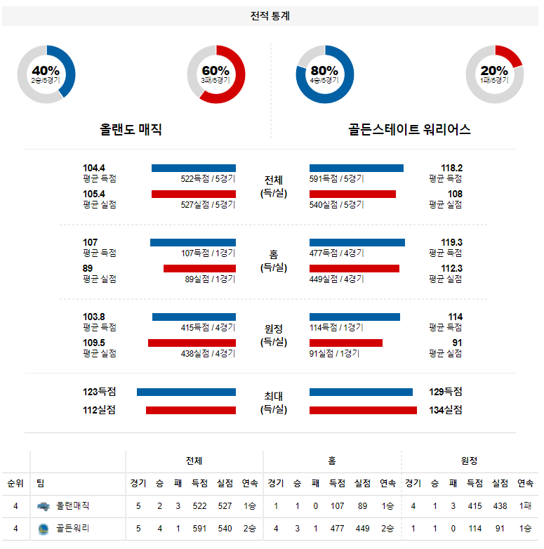 골든스테이트는 드레이먼드 그린의 출전 여부가 불투명하지만 개막 후 20경기에서 평균 20분 56초 동안 12.2점 6.1리바운드 1.3블록슛, 평균 야투율 50.3%에 3점슛 성공률 40.9%를 기록중이던 루키 센터 자원 제임스 와이즈먼 복귀 가능성의 문이 열려있다. 주축 선수들의 줄부상으로 백코트 수비에 약점이 있는 올랜도의 문제점이 스테픈커리를 만나서 부각 될 것이다. 골든스테이트 승리 가능성을 추천 한다.