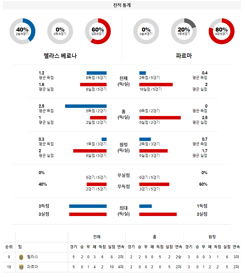 2. 베로나 이번 시즌 홈 성적 : 10전 5승 2무 3패 (무실점 비율 : 30%, 무득점 비율 : 20%)