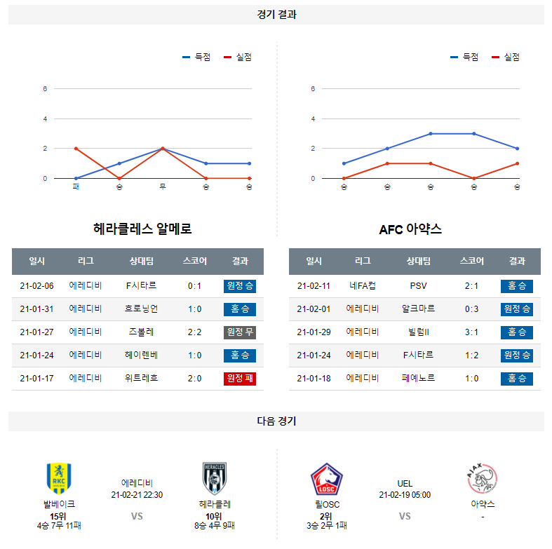 최근 일정 성과가 좋다. 흐로닝언(1-0, 승), 시타르트(0-1, 승) 상대로 연승을 달성했다. 최근 5경기에서 단 1패만을 허용했다. 수비진이 안정을 찾았으며, 승리를 챙긴 3경기에서 모두 무실점을 달성했다.