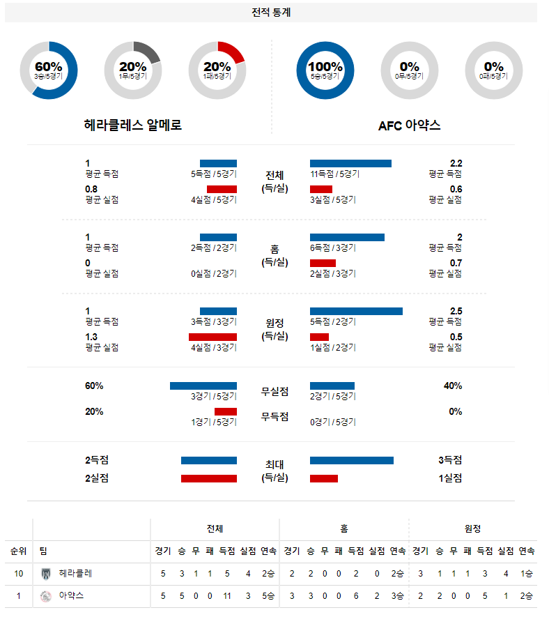 2. 헤라클레스 이번 시즌 홈 성적 : 10전 5승 1무 4패 (무실점 비율 : 40%, 무득점 비율 : 20%)