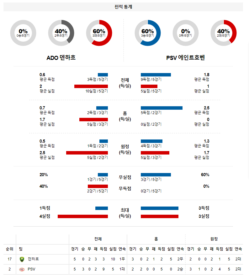 2. 덴하그 이번 시즌 홈 성적 : 10전 4무 6패 (무실점 비율 : 10%, 무득점 비율 : 40%)