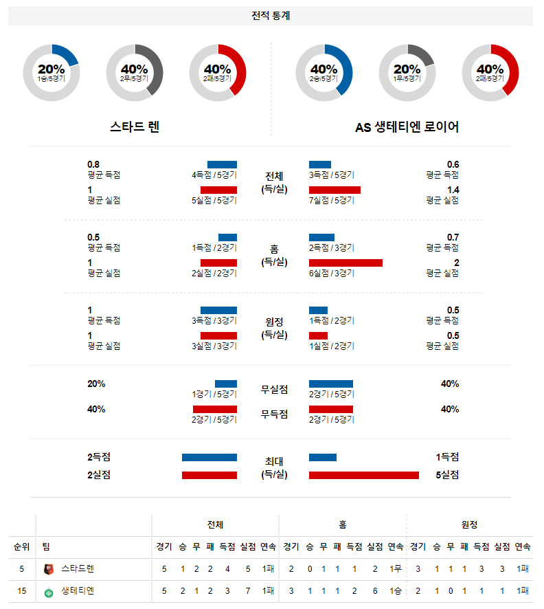 2. 렌 올 시즌 홈 성적 : 12전 5승 3무 4패 (무실점 비율 : 8%, 무득점 비율 : 25%)