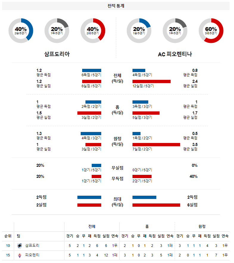 2. 삼프도리아 이번 시즌 홈 성적 : 10전 4승 1무 5패 (무실점 비율 : 10%, 무득점 비율 : 10%)