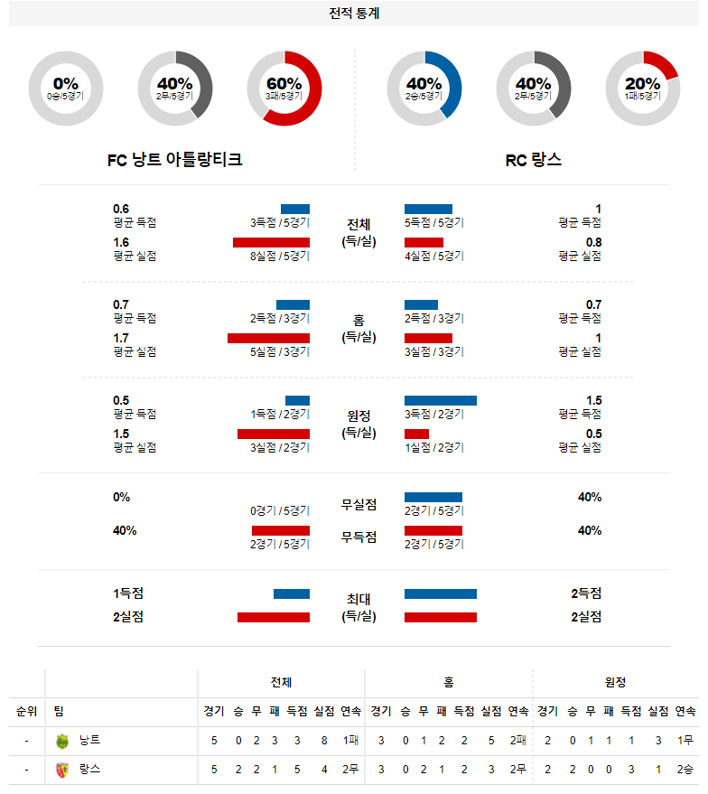 올 시즌 승격팀의 반란을 일으키고 있는 랑스는 홈보다 원정에서 더 많은 승리를 따내고 있다. 올 시즌 원정 승률이 무려 50%나 된다. 원정 경기 성적만 놓고 봤을 때도 리그 6위 자리를 지키고 있다. 낭트의 공수 밸런스가 완전히 무너진 상태인 만큼 이번 경기에서도 리드를 잡을 가능성이 충분하다.