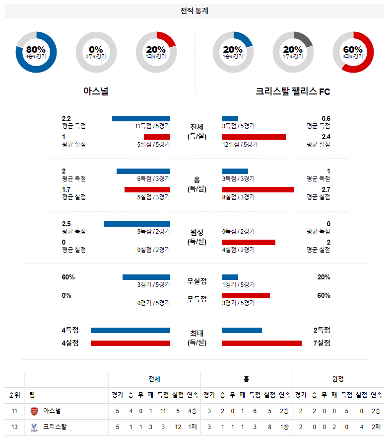 1. 최근 6경기 맞대결 : 6전 2승 3무 1패 14득점 11실점 (아스날 우세)