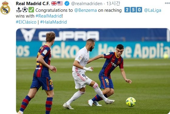 레알이 캄프 누 원정에서 열린 바르사와의 2020/21 시즌 스페인 프리메라 리가(이하 라리가) 7라운드에서 3-1로 승리했다. 이와 함께 레알은 4승 1무 1패로 라리가 1위 자리를 유지하는 데 성공했다.