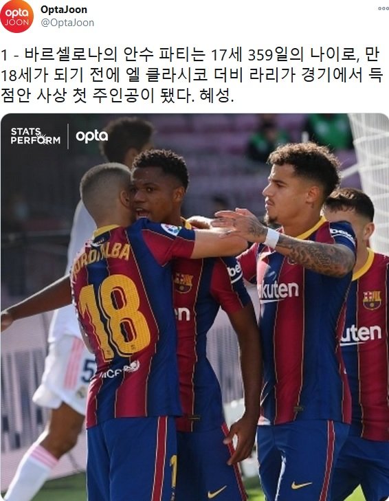 바르사도 라이벌전에서 쉽게 물러설 수 없었다. 첫 실점을 허용하고 곧바로 3분 만에 바르사는 에이스 리오넬 메시의 로빙 패스를 오버래핑해 올라간 왼쪽 측면 수비수 조르디 알바가 페널티 박스 안에서 땅볼 크로스로 연결했고, 이를 골문 앞으로 쇄도해 들어가던 '신성' 안수 파티가 논스톱 슈팅으로 골을 넣으며 승부를 원점으로 돌린 것. 이와 함께 라리가 역사상 최초로 만 18세가 되기 이전(만 17세 359일)에 엘 클라시코에서 골을 넣은 선수로 등극한 파티이다.