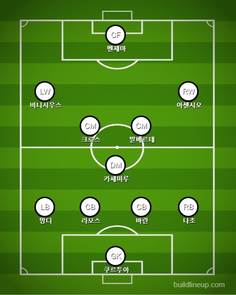 이번 바르사전은 달랐다. 레알은 바르사와의 경기에 가용 가능한 최정예로 나섰다. 벤제마가 최전방 공격수로 포진한 가운데 비니시우스와 마르코 아센시오가 좌우에 서면서 스리톱을 형성했다. 카세미루를 중심으로 크로스와 페데리코 발베르데가 역삼각형 형태로 중원을 구축했다. 페를랑 망디와 나초가 좌우 측면 수비를 책임졌고, 라모스와 라파엘 바란이 중앙 수비수로 선발 출전했다. 골문은 언제나처럼 티보 쿠르투아 골키퍼가 지켰다.