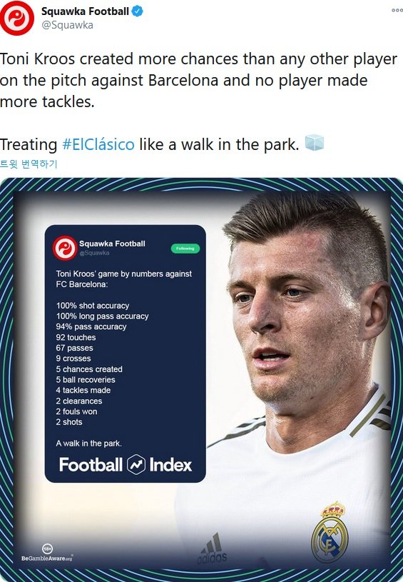 비단 이것이 전부가 아니다. 그는 양 팀 출전 선수들 중 가장 많은 4회 태클을 성공시켰고, 소유권 획득 횟수 5회에 더해 볼 경합에서 6회 승리하면서 수비에서도 헌신적인 모습을 보여주었다. 그가 버티고 있었기에 레알이 중원 싸움에서 바르사에 우위를 점할 수 있었다고 해도 과언이 아닐 정도였다.