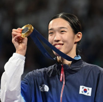 태권도 57kg급, 16년 만에 금메달 쾌거 세계랭킹 24위 김유진, 상위 랭킹 격파하며 결승 올라와금메달을 확정한 김유진이 8일(현지시각) 프랑스 파리 그랑 팔레에서 열린 2024 파리 올림픽 태권도 여자 57kg급 시상식에서 시상대에 올라 기뻐하고 있다. /파리=뉴시스[더팩트ㅣ김샛별 기자] 한국 태권도 김유진(23?울…
